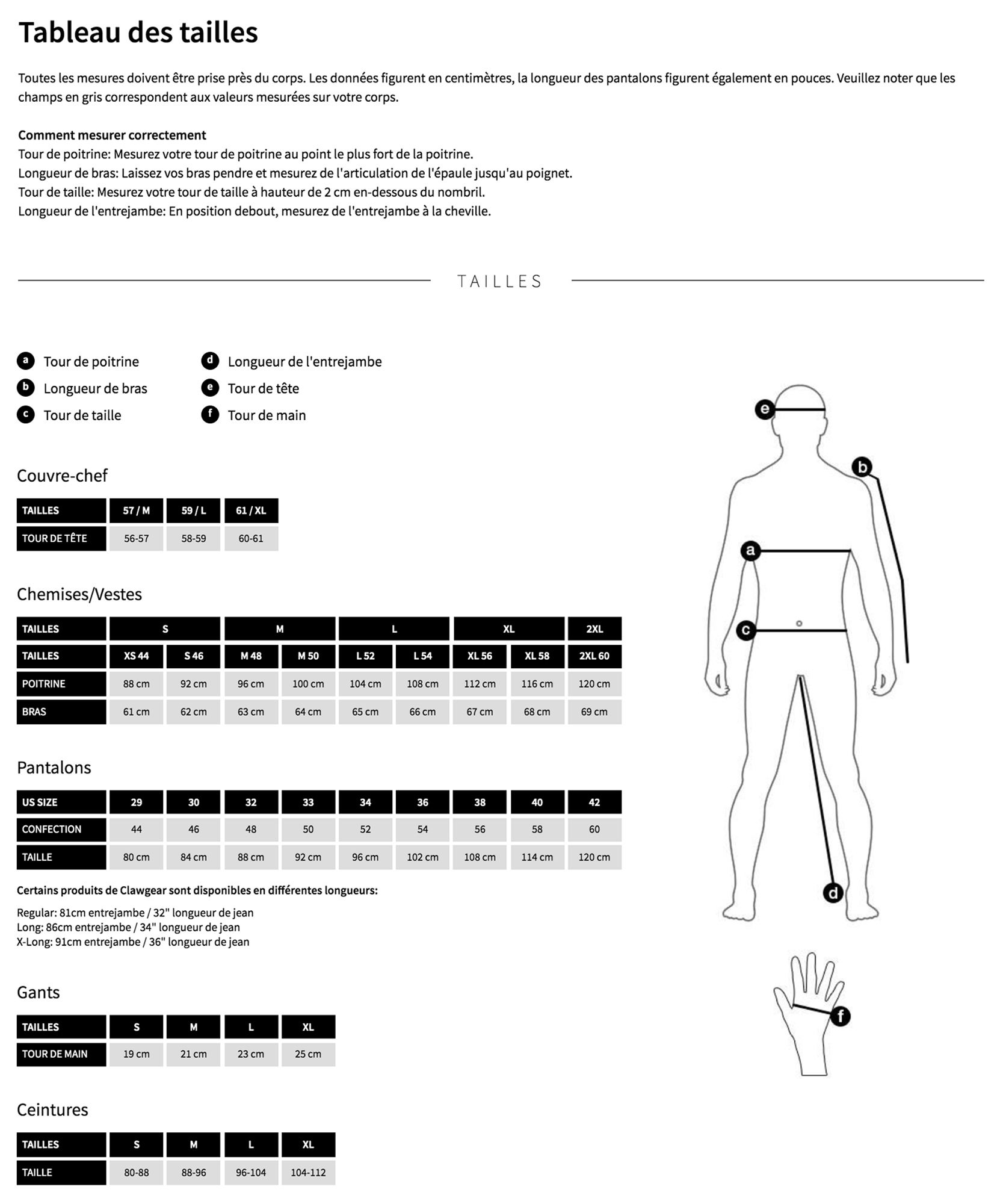 Tableau des tailles