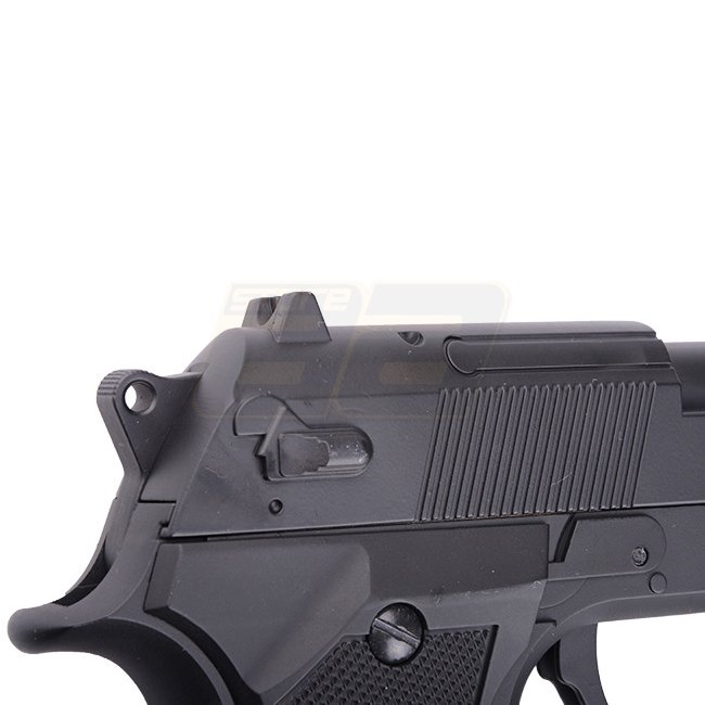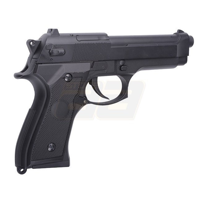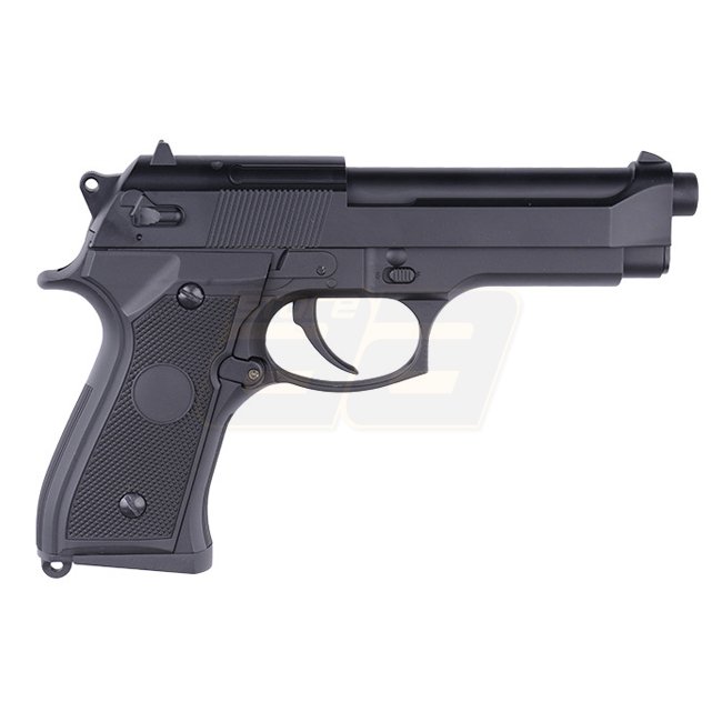 Cyma M9 AEP - Noir est un pistolet airsoft compact avec un cadre en plastique, un slide en métal et une capacité de chargeur de 30 billes. Il dispose des modes de tir semi-automatique et automatique, d'un hop-up ajustable, et est livré avec une batterie A