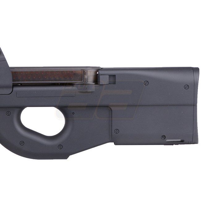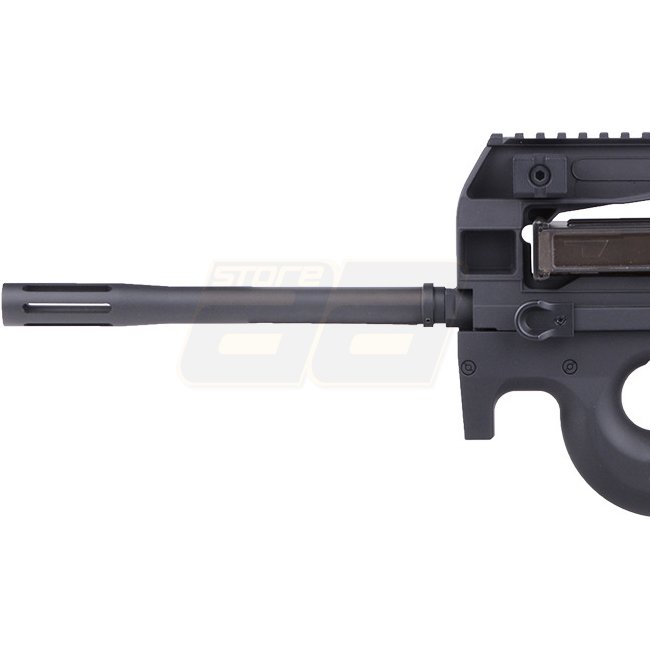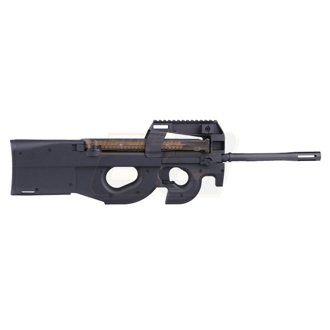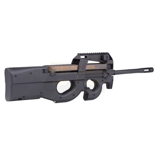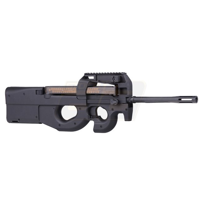 Fusil AEG Cyma P90 TR haute performance avec conception à long canon, Hop Up ajustable et portée de tir de 52,13 à 54,88 mètres. Modes semi-automatique et automatique, vitesse de bouche de 380 à 400 FPS.