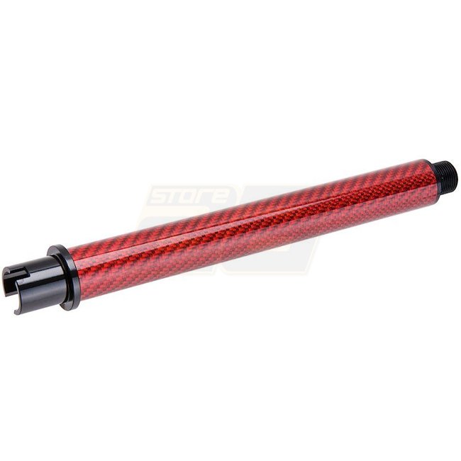 Améliorez votre Marui MWS GBBR avec ce canon externe en fibre de carbone rouge de 7 pouces - parfait pour les fusils M4/AR 15. Léger et durable à seulement 40g, il mesure 195 mm de long avec un filetage -14mm CCW.