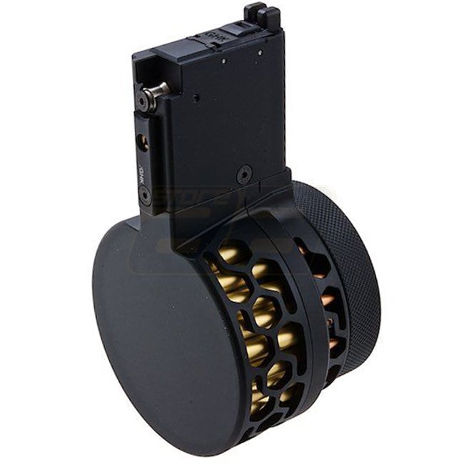 Les pistolets airsoft à gaz n'ont généralement pas la possibilité d'utiliser des chargeurs tambour jusqu'à il y a peu de temps, lorsque WE & AW Customs ont tous deux sorti des chargeurs tambour, mais le style de ces chargeurs tambour n'est pas exactement réaliste et ils ne conviennent qu'aux fusils airsoft à gaz fabriqués par WE ou AW Customs, et si vous voulez les adapter à d'autres fusils airsoft à gaz de la série M4 / AR-15 populaires, de nombreuses modifications seront nécessaires.