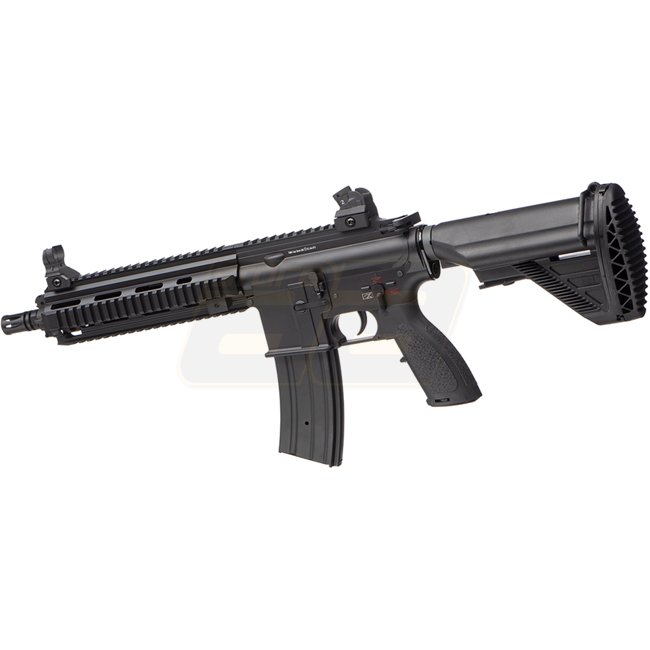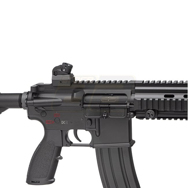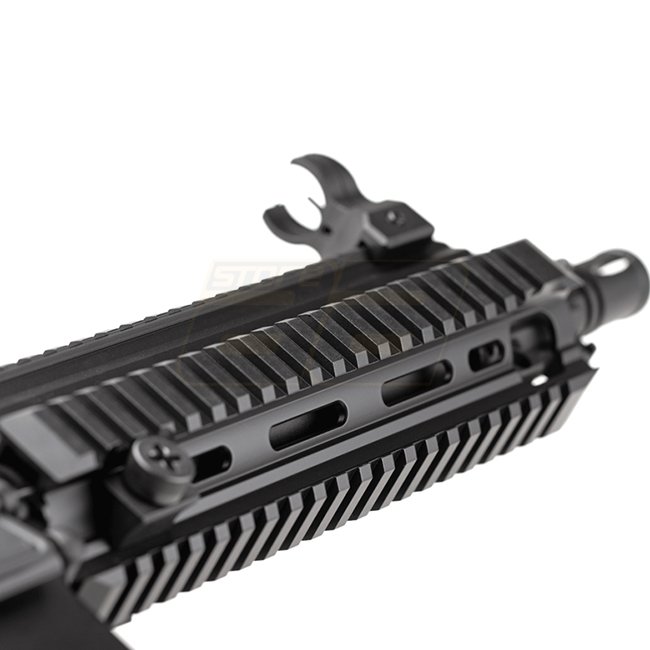 Cet E&C EC-102 QR 1.0 EGV S-AEG en noir est conçu pour le marché allemand, offrant uniquement un tir semi-automatique. Officiellement approuvé par le Besuchssamt, il comprend le F dans le marquage pentagonal. Il présente une construction en métal avec une
