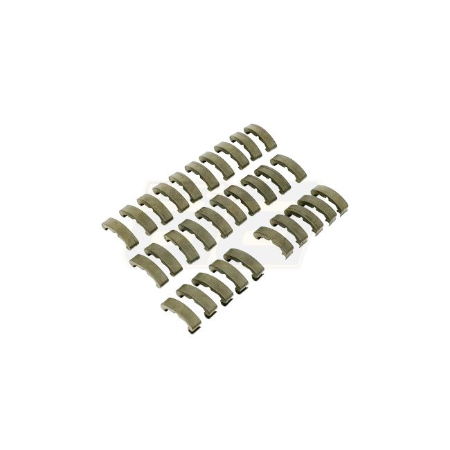 Clip d'index tactiques Element en couleur Terre Sombre. Attachez-les comme des supports pour accessoires sur le rail, utilisez-les comme couvertures de rail. Comprend 20 pièces normales, 5 supports supérieurs et 5 supports inférieurs pour le routage des f