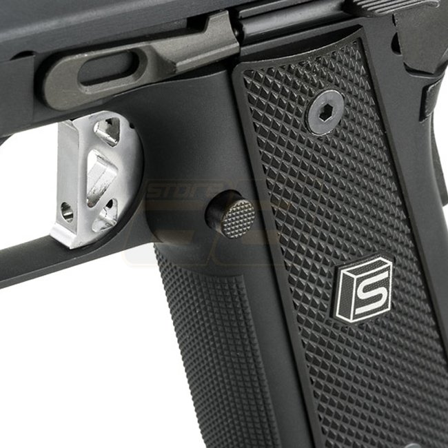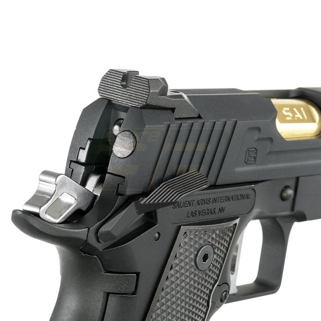 Pistolet à gaz Blow Back EMG SAI 5.1 - Noir : Pistolet EMG Salient Arms International Hi-Capa sous licence, compatible avec les chargeurs WE. Rail sous le canon pour lampe de type Picatinny.