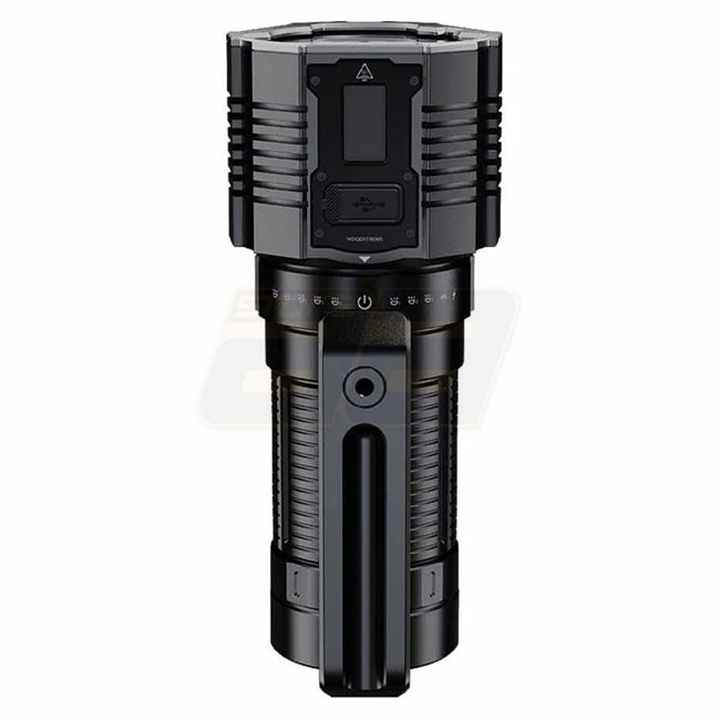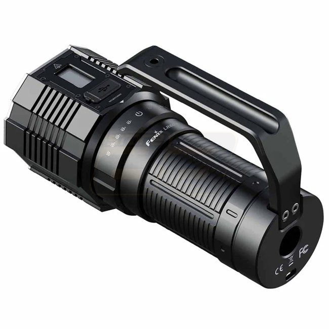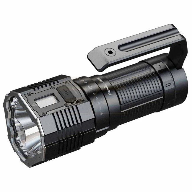 La Fenix LR60R associe un faisceau spot à un projecteur flood et développe jusqu’à 21 000 lumens. Elle atteint une portée d’environ 1 085 mètres en mode spot. Une molette mécanique permet le changement rapide de mode, tandis qu’un écran OLED affiche la durée restante, le niveau de batterie et le mode sélectionné. L’alimentation est assurée par un pack de batteries remplaçable, rechargeable par USB‑C.