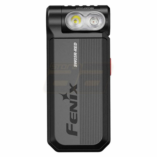 La Fenix SW05R‑UV associe une LED blanche à une LED UV (365 nm). Elle est équipée d’un clip pour fixation sur vêtement ou bordure, et d’une tête inclinable à ~200° pour orienter le faisceau. La batterie est intégrée et rechargeable via USB‑C.