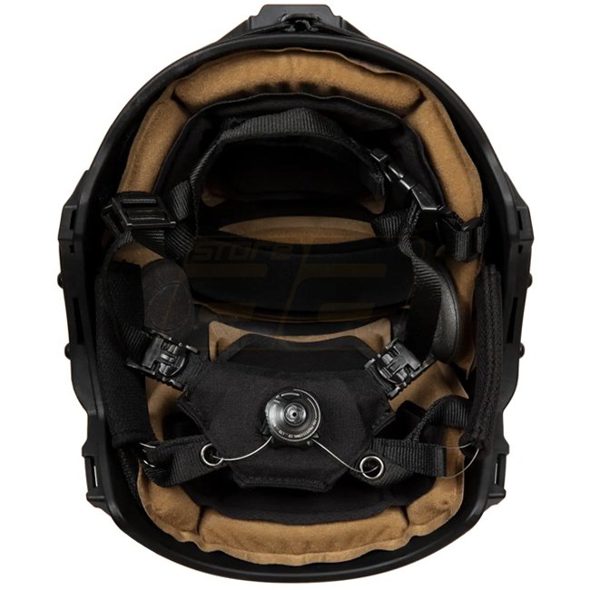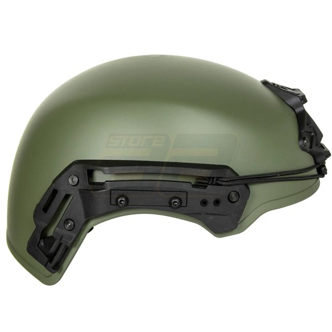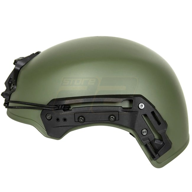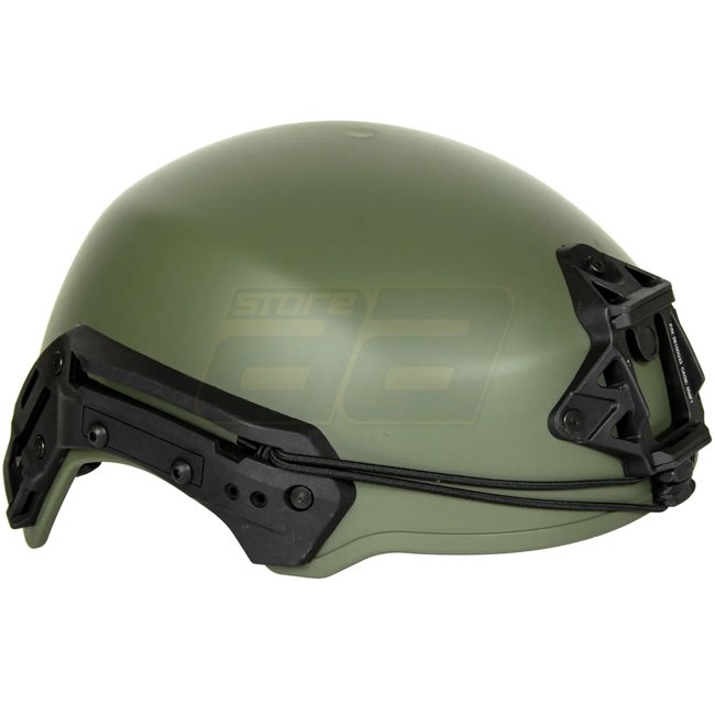 Casque FMA EX de style balistique en vert ranger, fabriqué en plastique ABS de 5,5 mm pour résister aux impacts, à la chaleur et aux basses températures. Taille 57-61 cm, poids 1000 g. Comprend le casque et un set de velcro.