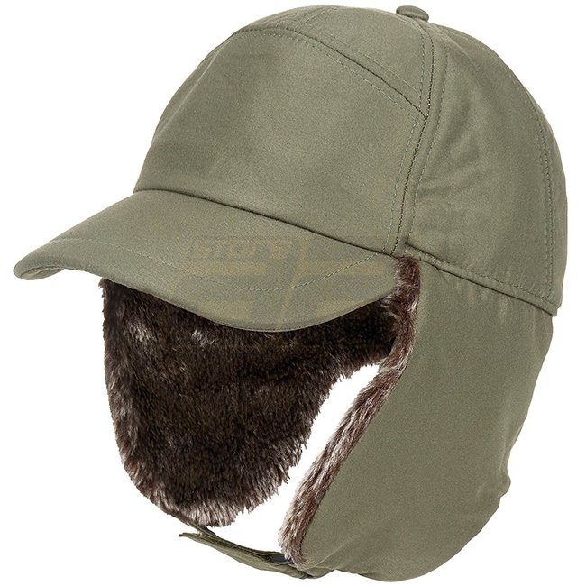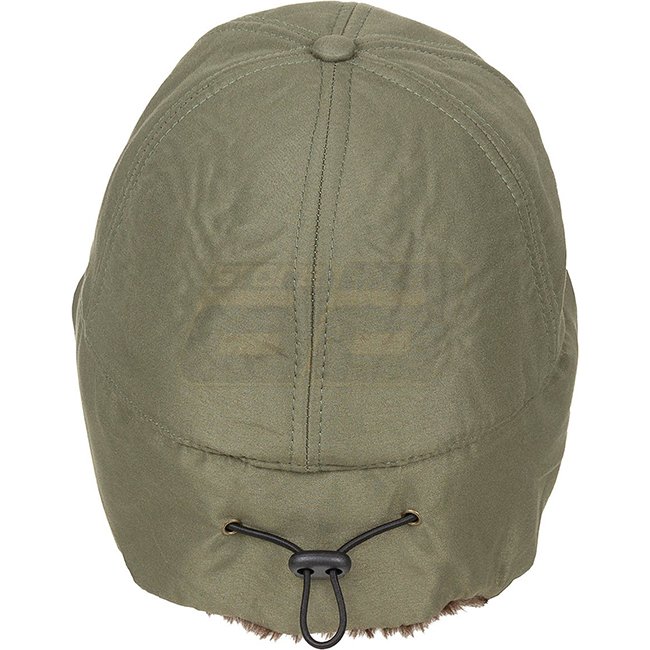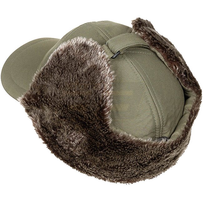 Bonnet d'hiver FoxOutdoor Trapper en olive avec oreillettes, visière, et détails en fausse fourrure. Cordon de serrage ajustable avec un stoppeur à l'arrière et doublure en polaire. Fabriqué en 100% polyester.