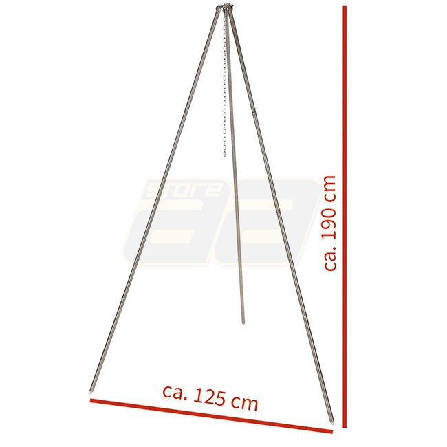 Chaîne à crochet et trépied FoxOutdoor 1,9 m, avec assemblage sans outil, hauteur réglable, pointes de sol stables, en acier inoxydable. Poids : environ 2,9 kg.