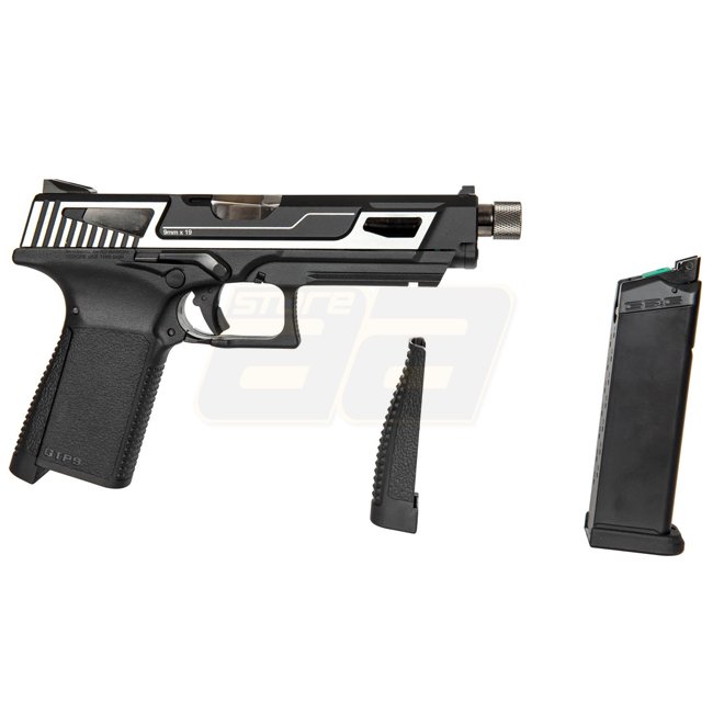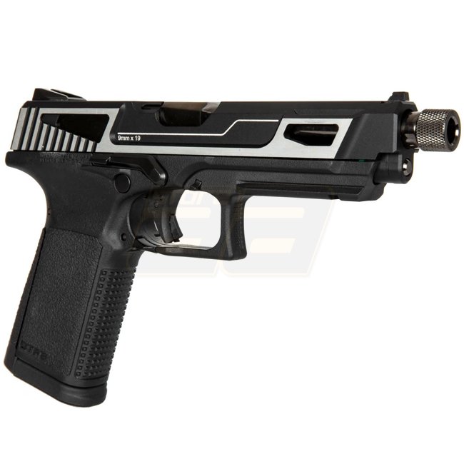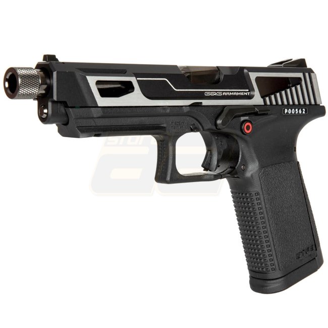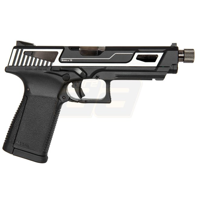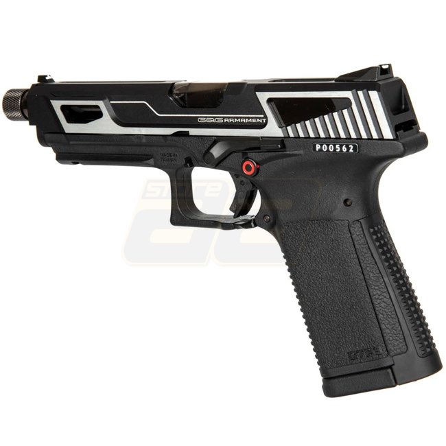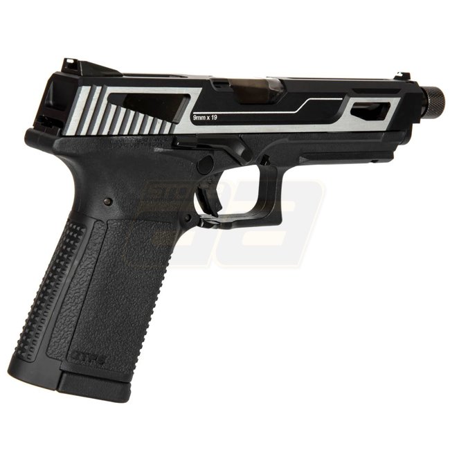 Pistolet à gaz G&G GTP9 MS Blow Back - Argent. Version avec glissière en métal. Poignée en polymère, chargeur de 22 billes, longueur de 219 mm, poids de 750 g, canon interne de 102 mm, 310-330 FPS, mode semi-automatique, portée de 42,53-45,27 m, hop-up ré