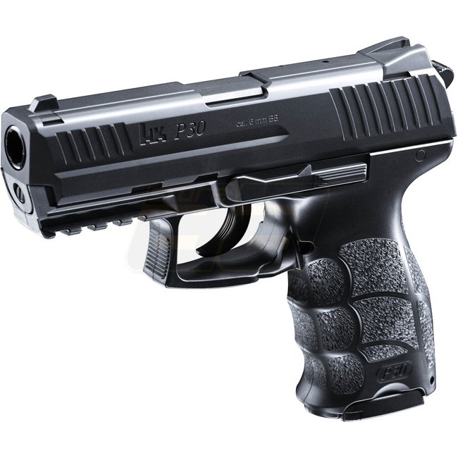Pistolet à ressort Heckler & Koch P30 de haute qualité au design noir élégant. Fabrication en matériau ABS Kunststoff, capacité du chargeur de 15 billes (6 mm), longueur de 180 mm, poids de 360 g, vitesse de 210-230 FPS, énergie à la bouche de 0,41-0,49 J