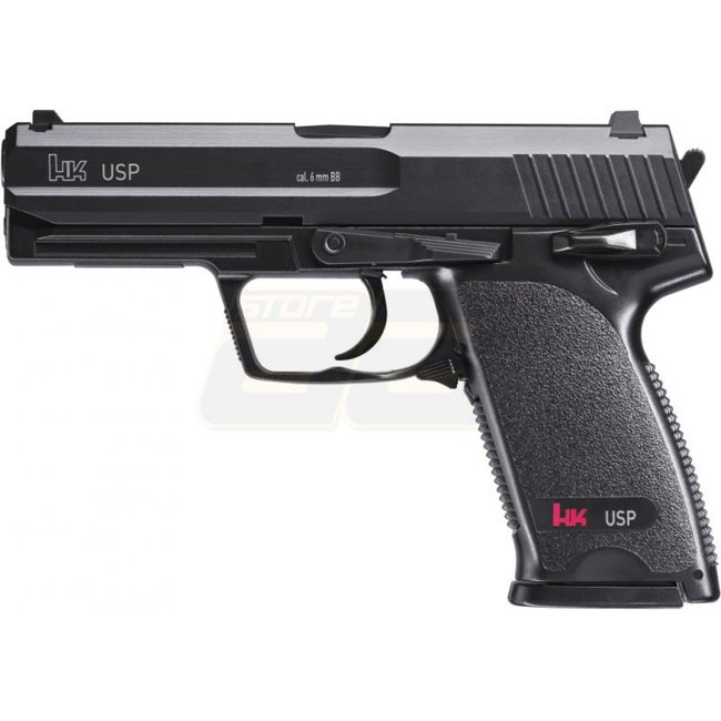Pistolet à ressort Heckler & Koch USP de haute qualité fabriqué en plastique ABS durable et en pièces métalliques. Caractéristiques d'un chargeur de 25 billes (6mm), longueur de 195 mm et poids de 580 g. Livré avec une longueur de canon intérieur de 90 mm