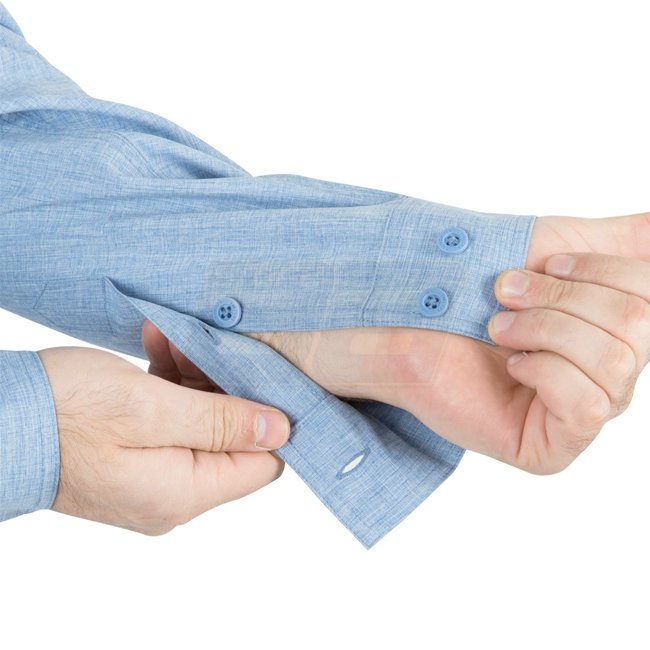 La chemise Helikon-Tex Defender Mk2 Gentleman en Melange Bleu Clair est une chemise respirante et à séchage rapide, fabriquée dans un tissu léger et élastique avec protection UPF30. Les caractéristiques incluent une coupe anatomique, un col qui ne roule p