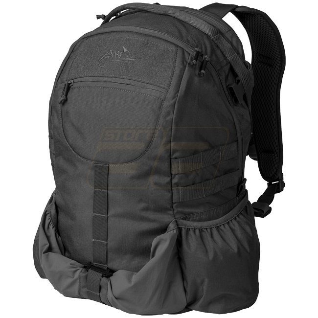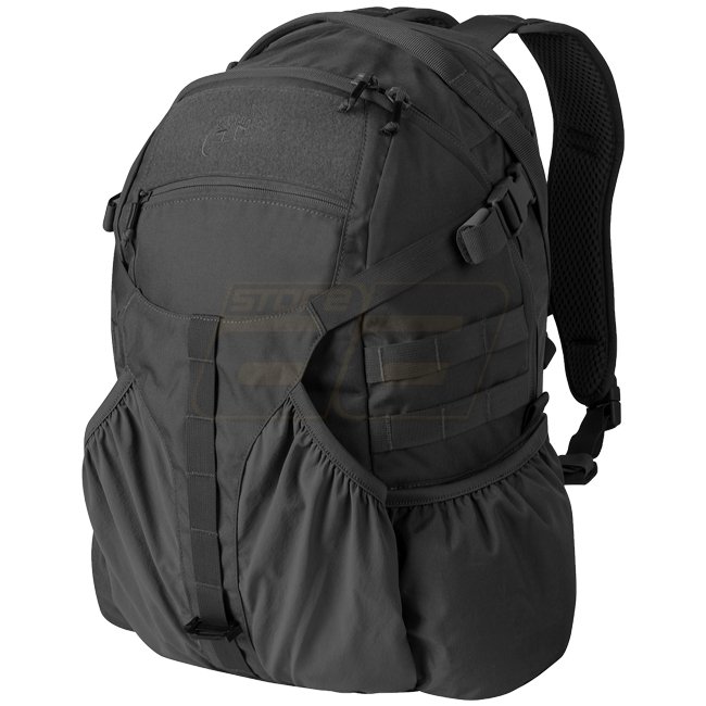 Sac à dos Helikon-Tex Raider en noir, fabriqué en tissu Cordura avec un système de port confortable, un panneau d'identification Velcro, des bretelles anatomiques, un système MOLLE/PALS, et des fermetures éclair YKK. Comprend un compartiment principal dou