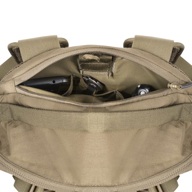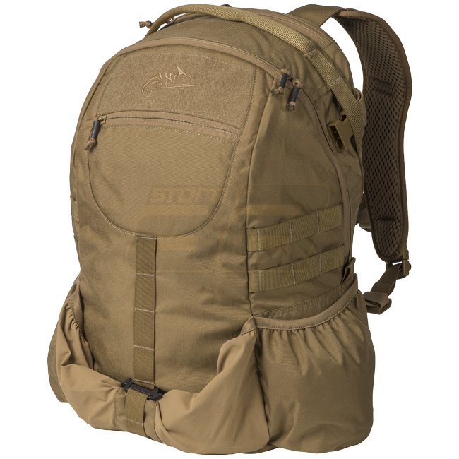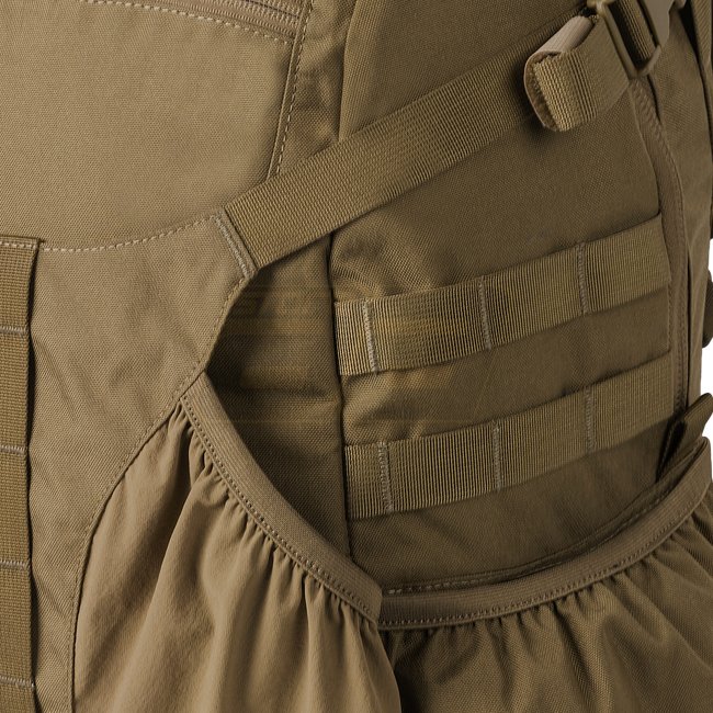 Sac à dos Helikon-Tex Raider de couleur coyote, fabriqué en tissu Cordura durable avec un panneau d'identification Velcro, une poignée de transport confortable et des bretelles anatomiques. Comprend un système MOLLE/PALS, des fermetures éclair YKK, un sup