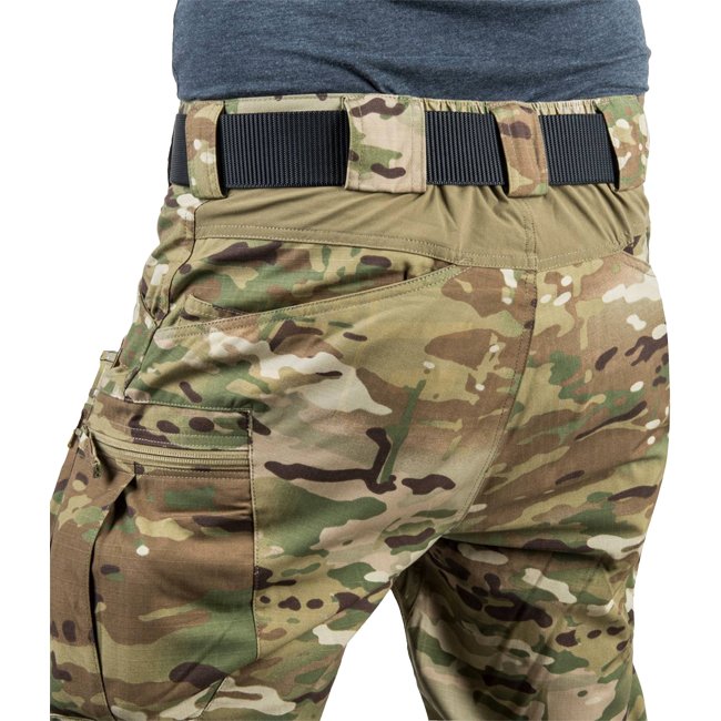 Pantalon Helikon-Tex UTP Urban Tactical Flex en couleur Multicam, taille 2XL - Regular. Conçu comme un modèle de ‘profil intermédiaire’ pour offrir la fonctionnalité de pantalons tactiques dans un style moins uniforme. Comprend une taille élastique, de la