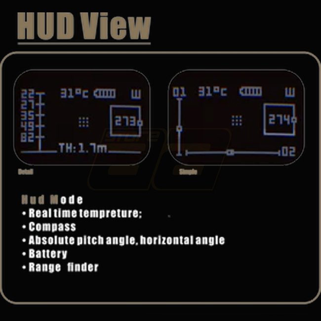 • Affichage: Interface HUD OLED fournissant boussole, température, état de la batterie, gyroscope et télémètre stadimétrique