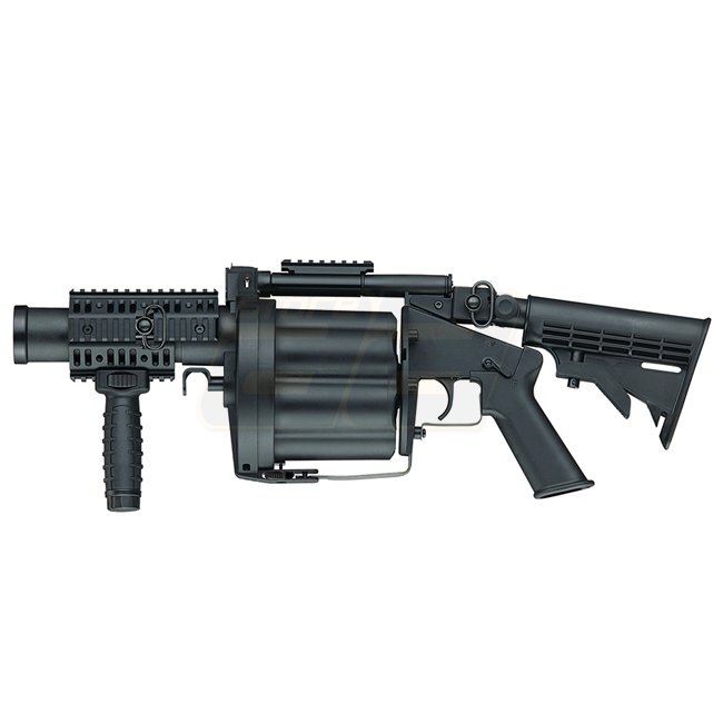 Lance-grenades multiple ICS MGL de couleur noire élégante. Fabriqué en polymère renforcé avec une capacité de 6 grenades (40mm Shower). Longueur ajustable entre 631-729mm et pèse 2150g. Le paquet comprend le lance-grenades.