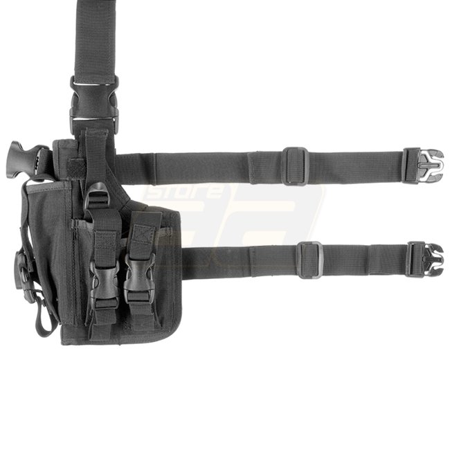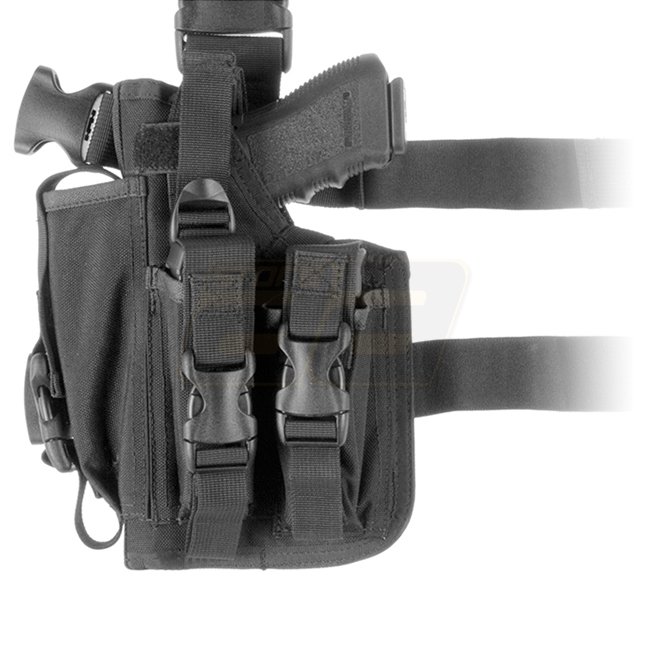 Étui SOF universellement conçu pour les pistolets moyens et grands tels que Glock 17, Beretta 92 ou SOCOM MK23, peut accueillir des armes avec lampe de poche/viseur laser. Pochettes pour chargeur intégrées et panneau de jambe, sécurisés par une sangle aju