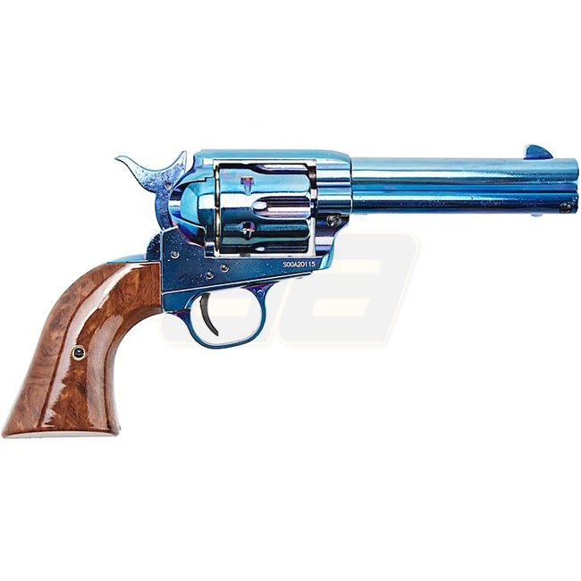 King Arms SAA .45 Peacemaker Révolver à Gaz S - Bleu. Construction en métal/polymer, chargeur de 6 coups, longueur de 260 mm, poids de 948 g. Canon intérieur de 117 mm, tir semi-automatique à 300-320 FPS / 0,84-0,95 Joule. Portée effective de 41,16-43,90