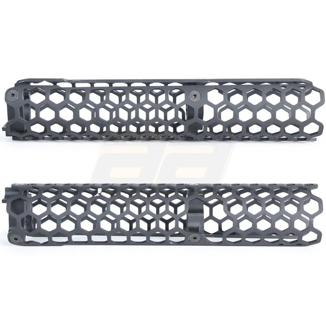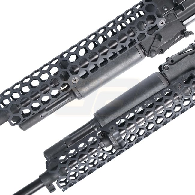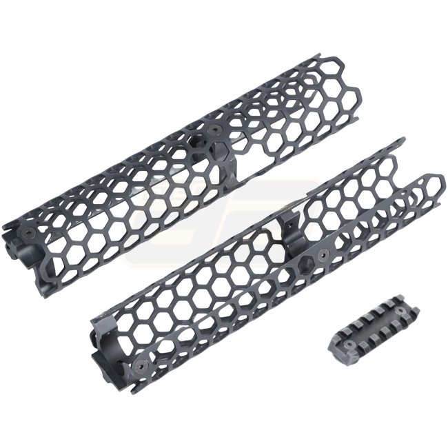 Garde-main hexagonal Kizuna Works AK-105 : construction CNC en aluminium T6061 de qualité supérieure, longueur de 258 mm, poids de 125 g. Compatible avec LCT, GHK, E&L. Comprend un rail Picatinny à 6 emplacements.