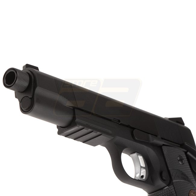 Pistolet à gaz blowback KJ Works M1911 MEU TBC - Noir. Métal / Polymère, Capacité du chargeur : 26 (6 mm), Longueur : 235 mm, Poids : 960 g, Longueur du canon intérieur : 110 mm, Vitesse de sortie : 320-340 FPS, Mode de tir : Semi-auto, Portée de tir : 43