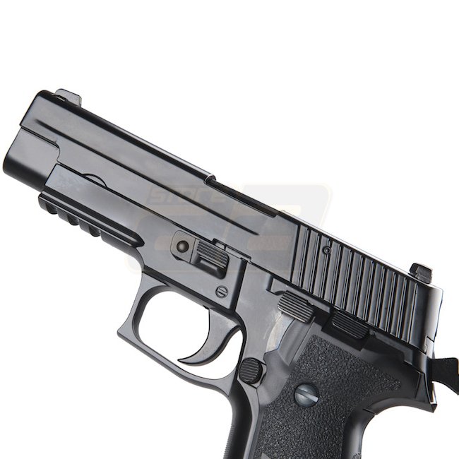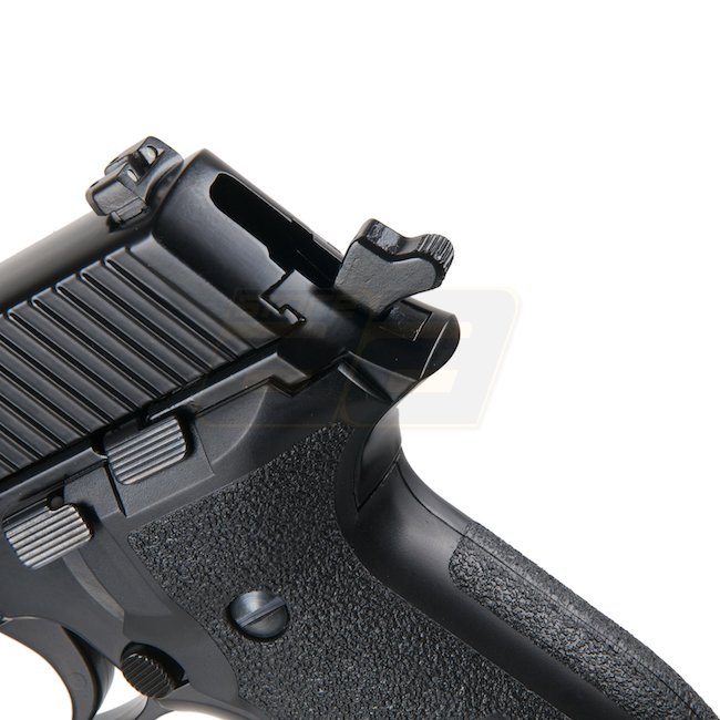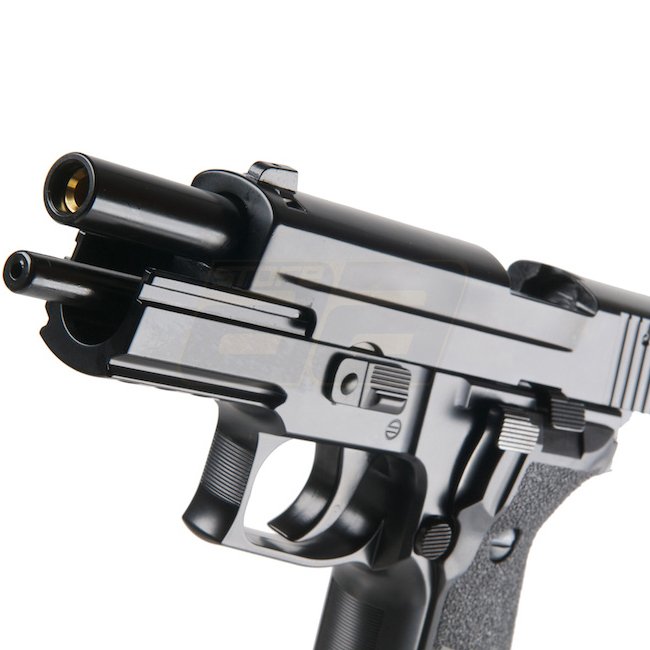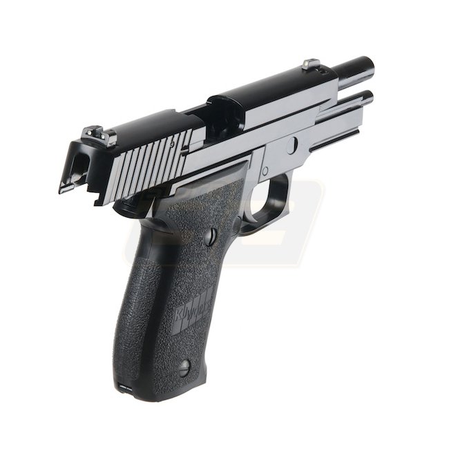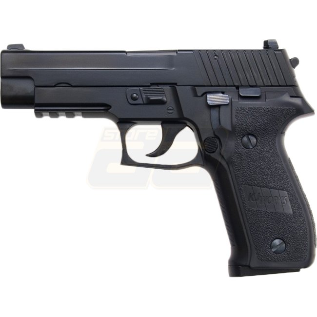 Pistolet à gaz KJ Works P226 avec système Blow Back - Poignée en métal/plastique, chargeur de 24 cartouches, longueur de 188 mm, 1130 g, canon intérieur de 97 mm, 280-300 FPS, semi-automatique, portée de tir de 38,41 à 41,16 m. Hop-up réglable. Le paquet