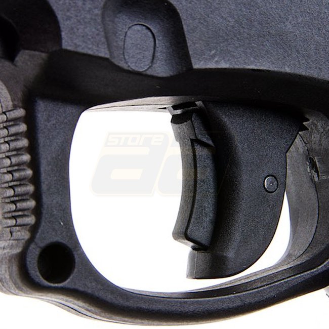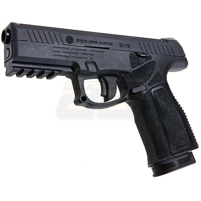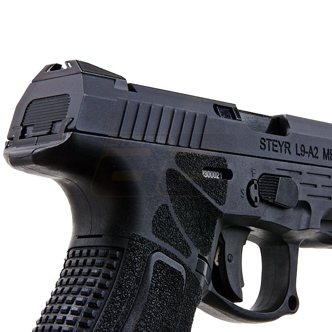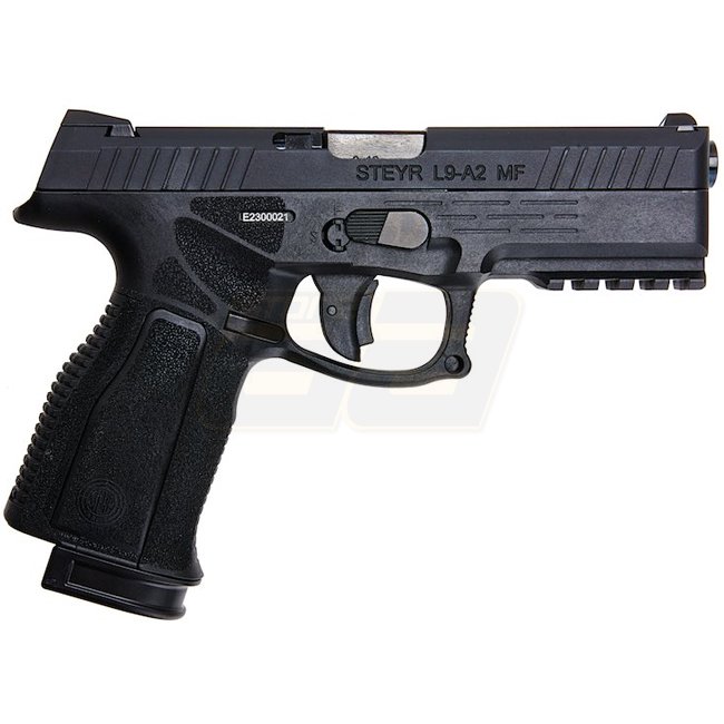 Pistolet à gaz soufflant KJ Works STEYR L9A2 - Noir. Glissière en métal avec poignée et cadre en plastique, capacité de magasin de 22 cartouches, longueur de 200 mm, poids de 850 g, longueur du canon interne de 103 mm, vitesse de bouche de 300-320 FPS, mo