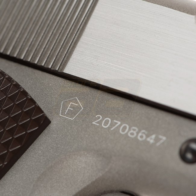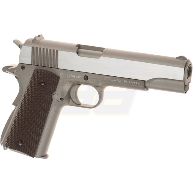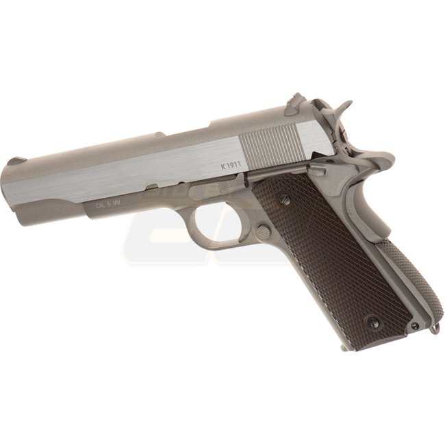 Pistolet KWC M1911 Co2 Blow Back - Argent. Construction en métal/plastique, capacité de 16 cartouches, longueur de 205mm, poids de 890g, canon interne de 100mm, vitesse de 300-320 FPS, semi-automatique, portée de 41,16-43,90m, hop-up réglable. Inclus : pi