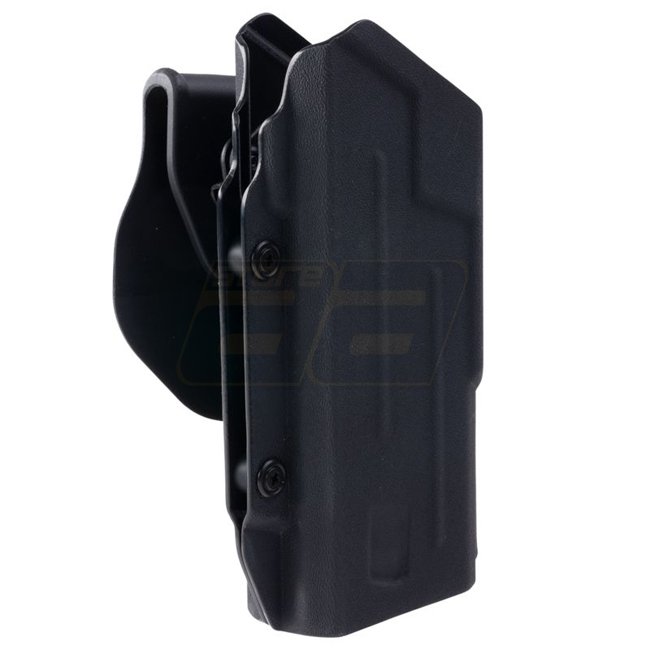 Holster en Kydex moulé avec précision pour le Krytac SilencerCo Maxim 9 GBB, développé par Laylax / Nine Ball. Offre un maintien sûr, une extraction fluide et une excellente adaptation à la forme de l’arme.