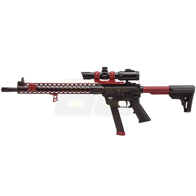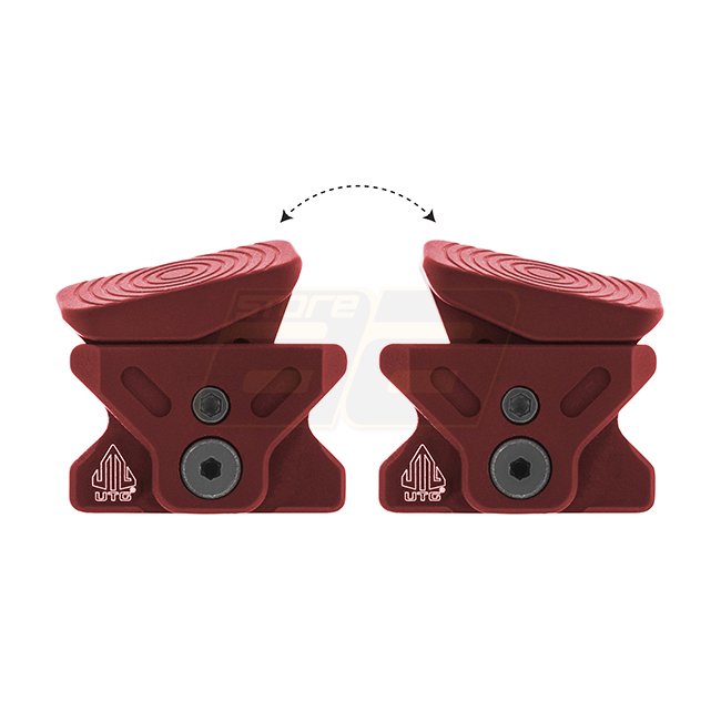 Leapers Keymod Support Incliné - Rouge, conception réversible pour installation côté gauche/droite, indexation pouce configurable pour inclinaison avant/arrière, inclut un espaceur amovible pour différents profils de garde-main, fabriqué en aluminium 6061