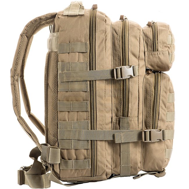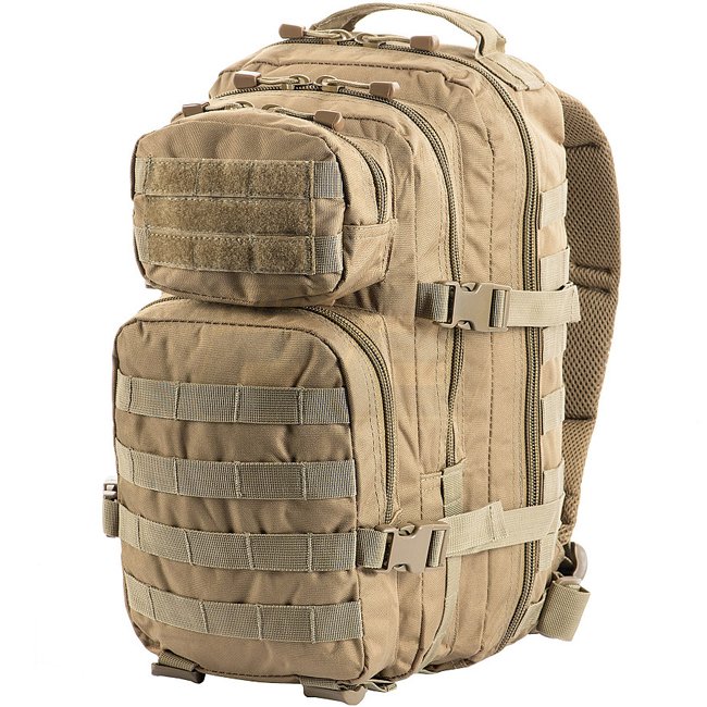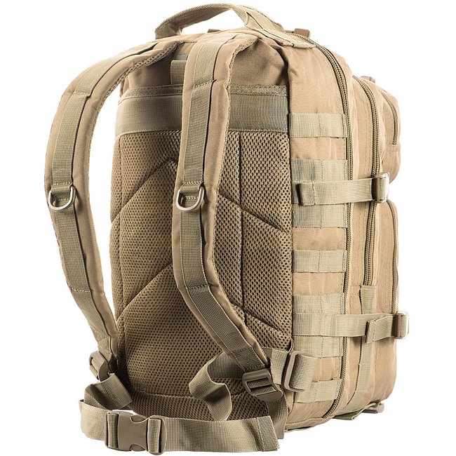 Sac à dos M-Tac Assault Pack - Tan : Sac à dos prêt pour la ville avec système MOLLE, 2 compartiments principaux, poches zippées supplémentaires et bretelles rembourrées. Matériau : 100% polyester. Volume : 20L. Poids : 1100g. Dimensions : 42x20x25cm.