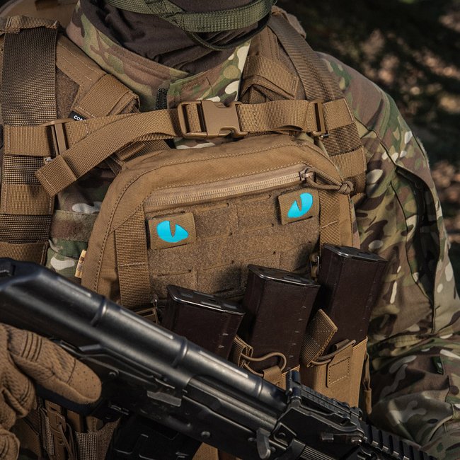 Écusson M-Tac Yeux de Tigre Bleu Découpe Laser - Coyote 40x25 mm fabriqué en Cordura 500D avec un matériau emmagasinant la lumière sur le devant et une surface à crochet à l'arrière.