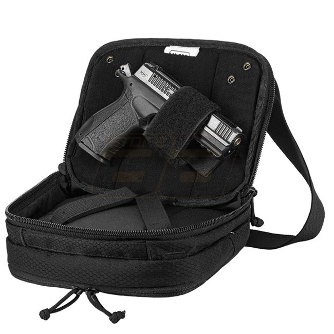 Le système de dégagement rapide permet un accès ultra-rapide à l'arme. Pour les droitiers, la sangle droite s'attache sur le côté droit de la poche arrière. Pour dégainer l'arme, le sac s'ouvre avec la main gauche tandis que la main droite s'en charge l'accès. Pour les gauchers, le système fonctionne à l'envers : la boucle gauche est attachée et la main droite ouvre le sac.