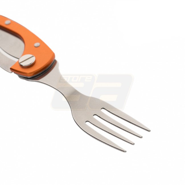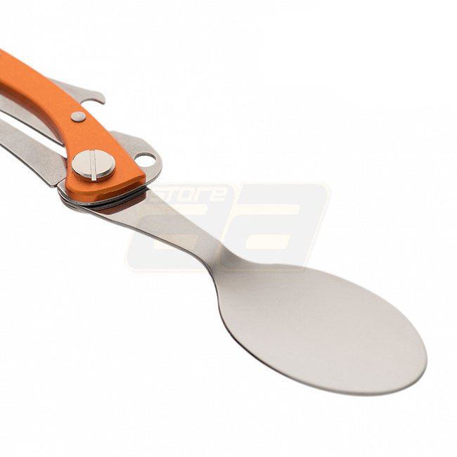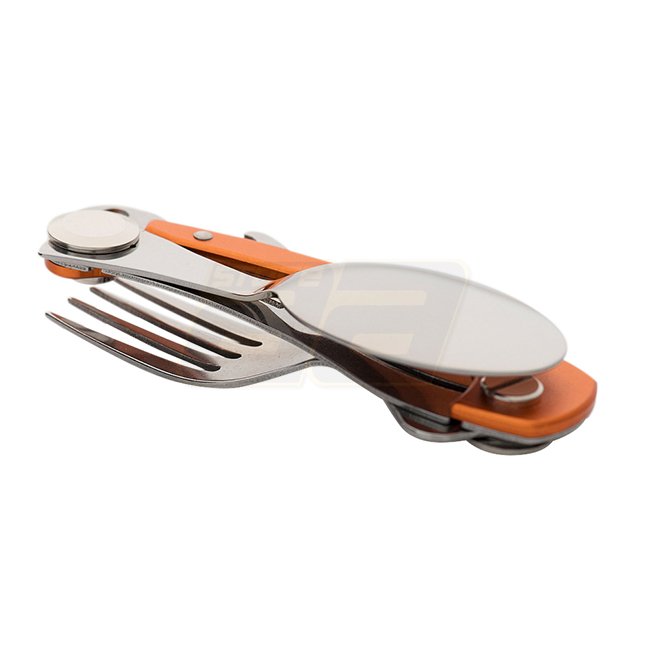 L'ensemble de couverts fonctionnels pour le voyage comprend les articles les plus nécessaires : cuillère, fourchette, bouteille et ouvre-boîte. Tout cela dans un seul corps ressemblant à un multitool. Multitool pour la nourriture si vous voulez...