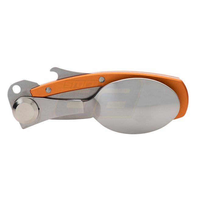 Ensemble de couverts fonctionnels pour les voyages avec cuillère, fourchette, ouvre-bouteille et ouvre-boîte, le tout dans un seul corps semblable à un multitool. Fabriqué en acier inoxydable 420 et en aluminium, mesurant 10,5 x 4,2 x 1,5 cm.