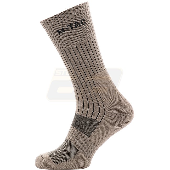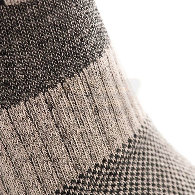 Les caractéristiques de conception des chaussettes hautes Mk.2 comprennent des zones spéciales d'absorption thermique et des chocs à l'avant-pied et au talon avec une transition vers le cou-de-pied, protégeant la cheville des entorses et des contraintes mécaniques. Pour améliorer les performances lors de marches intenses, un collier de voûte plantaire latéral a été ajouté pour éviter que la chaussette ne se plisse en bas. Le large revers répartit uniformément la charge pour maintenir la chaussette sur votre tibia. Toute la surface du pied est doublée d'un tissage éponge interne qui répartit uniformément la charge sur l'ensemble du pied. Les chaussettes de trekking avec des zones thermiques texturées absorbent la majeure partie de l'humidité et à travers les canaux de ventilation existants, les capillaires éliminent l'humidité à travers la tige de la chaussure. De plus, elles se combinent parfaitement avec les bottes à membrane, car le processus de transport de l'humidité vers l'extérieur est encore plus rapide.