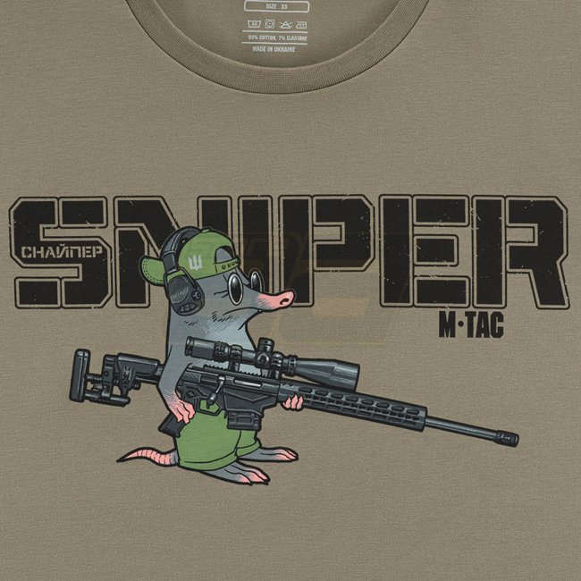 Un design humoristique pour les tireurs d'élite en devenir - T-shirt M-Tac Mole en couleur tan, taille XS. Représente une taupe aveugle en tant que sniper, symbolisant l'ambition et la confiance en soi. Matériau : 93 % coton, 7 % élasthanne. Poids : 190 g