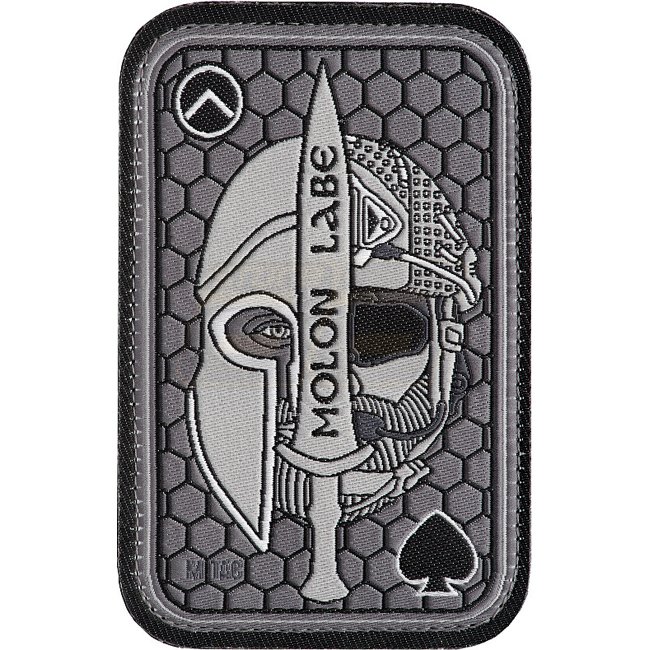 M-Tac Molon Labe Ace Écusson tissé - Gris, fabriqué avec un matériau frontal en Oxford, matériau arrière à surface auto-agrippante. Les dimensions sont de 68 x 108 mm.