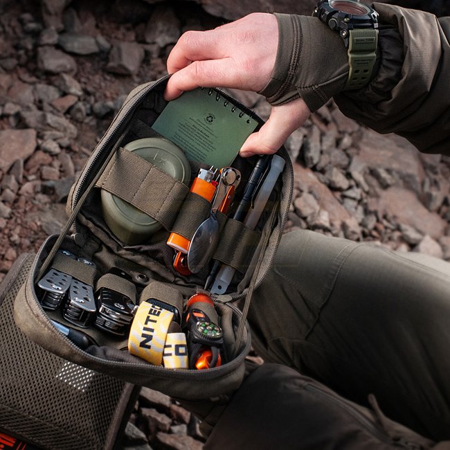 Cette pochette multi-usages permet de transporter une trousse de secours, une trousse EDC (stylo, couteau, lampe torche, carnet, multitool, etc.) ou une trousse de survie individuelle. Il peut être attaché aux sacs à dos et aux gilets à l'aide du système MOLLE et s'ouvre à 90 degrés.