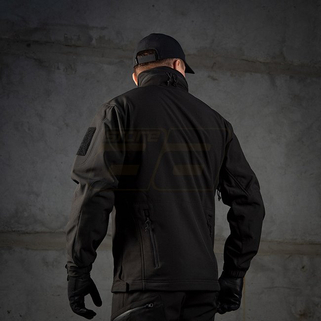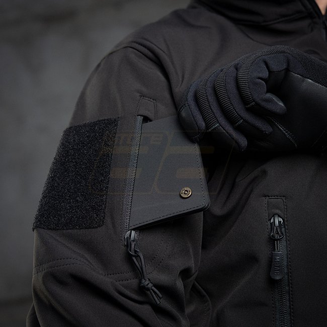 Veste de Police M-Tac Soft Shell - Noir - L. Veste soft shell imperméable avec couche en polaire, panneaux d'identification, accès par les bras latéraux. Design léger à double couche pour une protection contre le vent et les intempéries. Tissu extérieur d