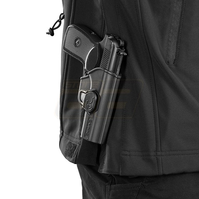 La veste Soft Shell est composée d'une membrane intercalaire en polyuréthane qui protège des intempéries. À l'intérieur, il a une fine couche de polaire. Il dispose de deux panneaux d'identification qui, selon la situation, peuvent être retirés ou rester cachés. Les panneaux vides peuvent être imprimés ou emproided. Un système d'ouverture latérale permet un accès rapide à une arme latéral.