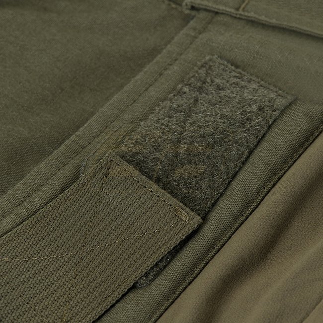 La ceinture du pantalon est réglable à l'aide de sangles en toile, et il est conçu pour être porté avec une ceinture jusqu'à 5,5 cm de large. Il y a deux anneaux en D à l'avant pour attacher divers équipements. La largeur de la zone des genoux est réglable à l'aide de velcro. Un cordon élastique est tendu le long du bord inférieur du pantalon et des fermetures velcro permettent d'ajuster la taille.