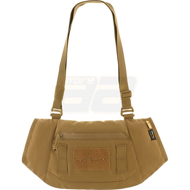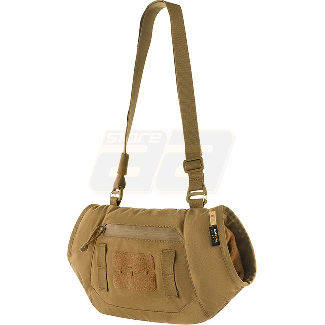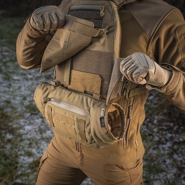 Avec la bandoulière, le manchon peut être porté dans n'importe quelle position ainsi qu'avec une combinaison de vêtements différents. Spécialement destiné aux militaires, ce modèle est équipé d'une bande velcro et conçu pour être fixé sur un panneau velcro sous la face avant d'un porte-plaque. S'il n'y a pas de panneau Velcro sur le gilet, le manchon peut être attaché à un système MOLLE à l'aide de connecteurs en forme de T.