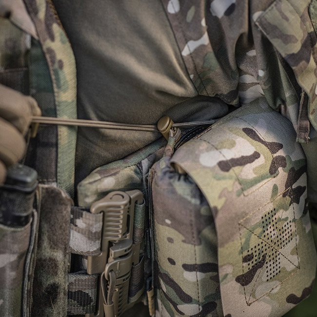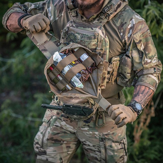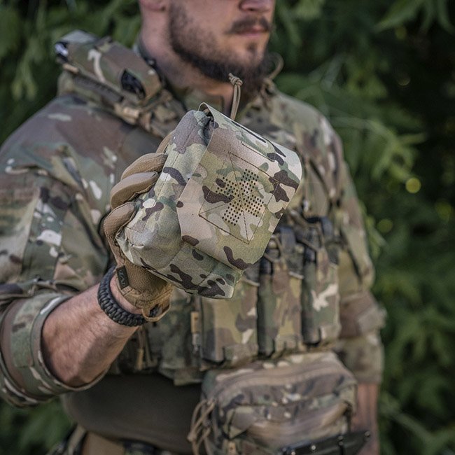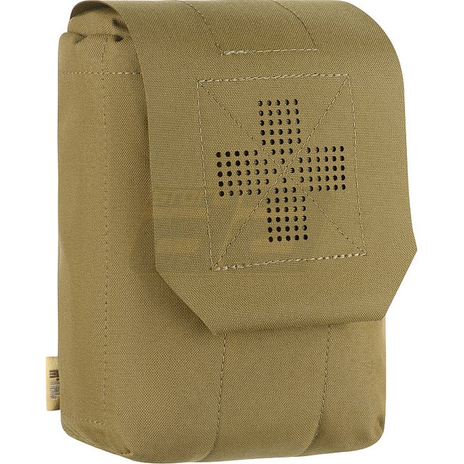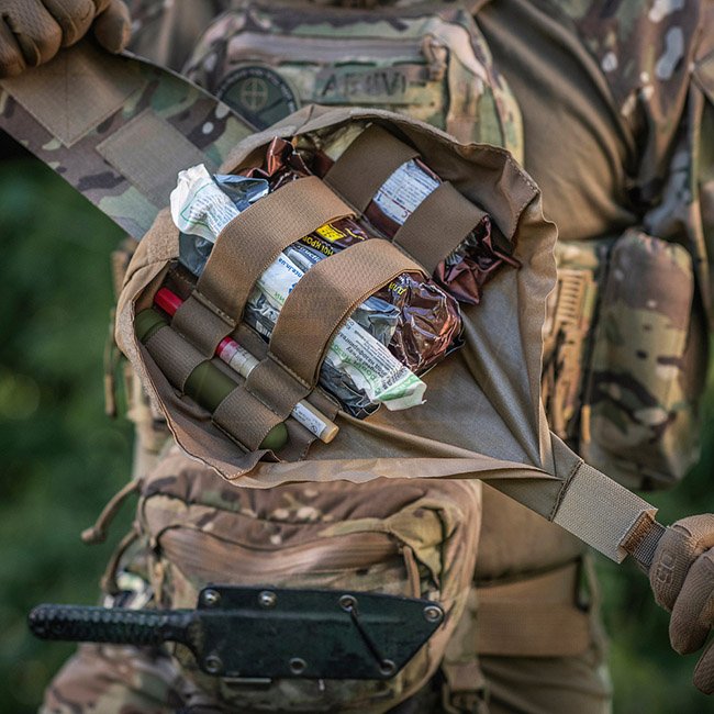 La pochette extérieure est en Cordura 500D - un matériau durable qui résiste à l'abrasion et aux charges élevées. Les parois latérales intérieures sont en nylon élastique, grâce auquel il conserve sa forme. Un élément de fixation supplémentaire est une sangle qui vous permet de maintenir en toute sécurité la trousse de premiers secours, même pendant l'activité. Se fixe à l'équipement à l'aide de l'interface MOLLE.