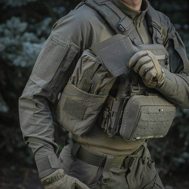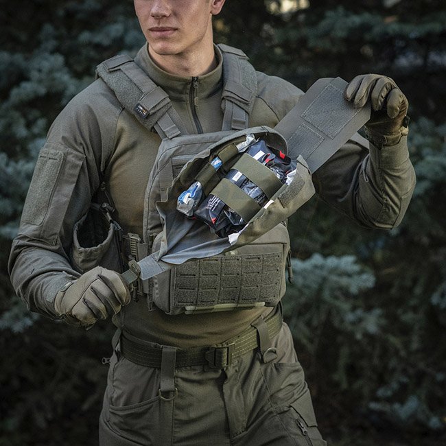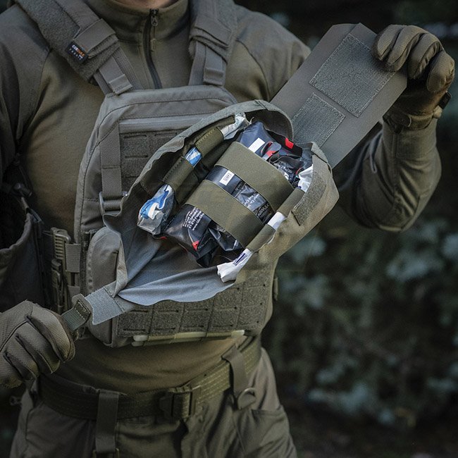 Pochette Médicale Verticale Grande Elite M-Tac en Vert Ranger avec matériau Cordura 500D. Comprend un organisateur de trousse de premiers secours basé sur le modèle IFAK, méthode d'extraction verticale, parois intérieures en nylon élastiqué, et attachemen