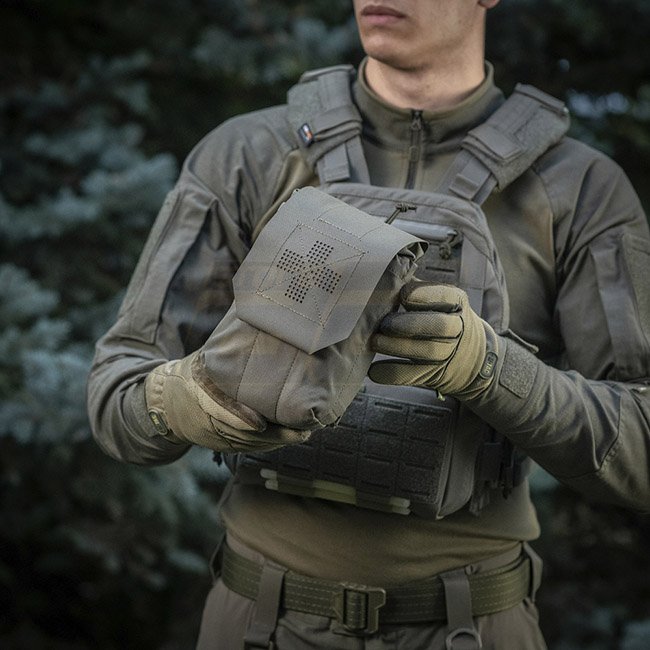 La pochette extérieure est en Cordura 500D - un matériau durable qui résiste à l'abrasion et aux charges élevées. Les parois latérales intérieures sont en nylon élastique, grâce auquel il conserve sa forme. Un élément de fixation supplémentaire est une sangle qui vous permet de maintenir en toute sécurité la trousse de premiers secours, même pendant l'activité. Se fixe à l'équipement à l'aide de l'interface MOLLE.