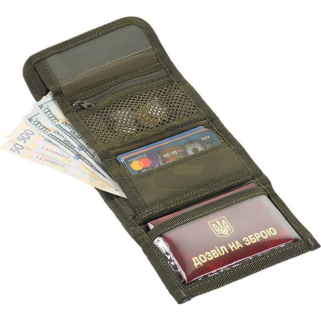 Il a deux grands compartiments pour les billets, des compartiments pour les cartes et des compartiments en plastique pour les documents. Il y a aussi une poche pour la monnaie, qui se ferme avec une fermeture éclair. Le panneau velcro avant vous permet d'attacher divers patchs.