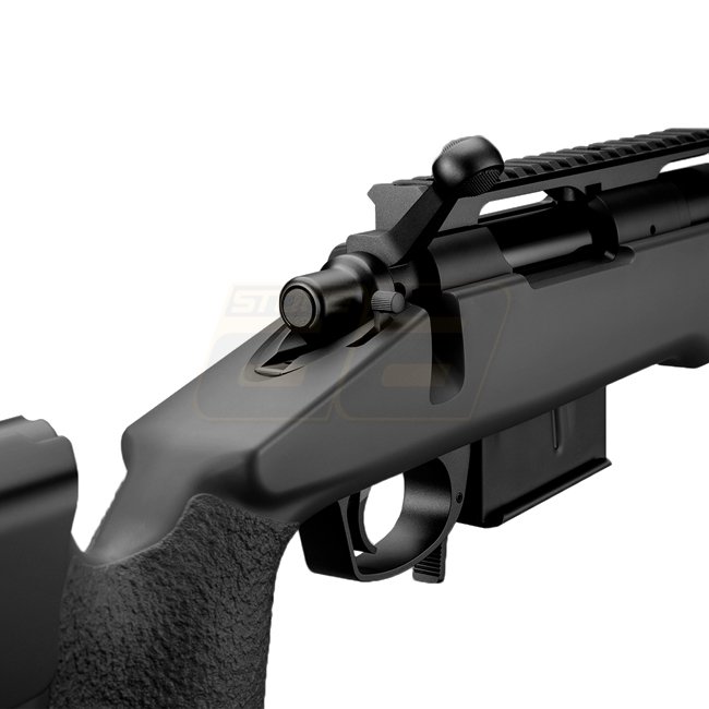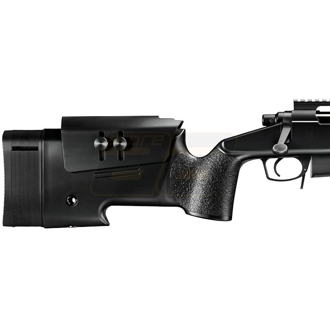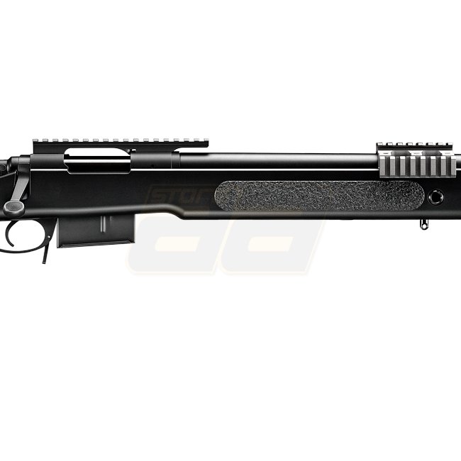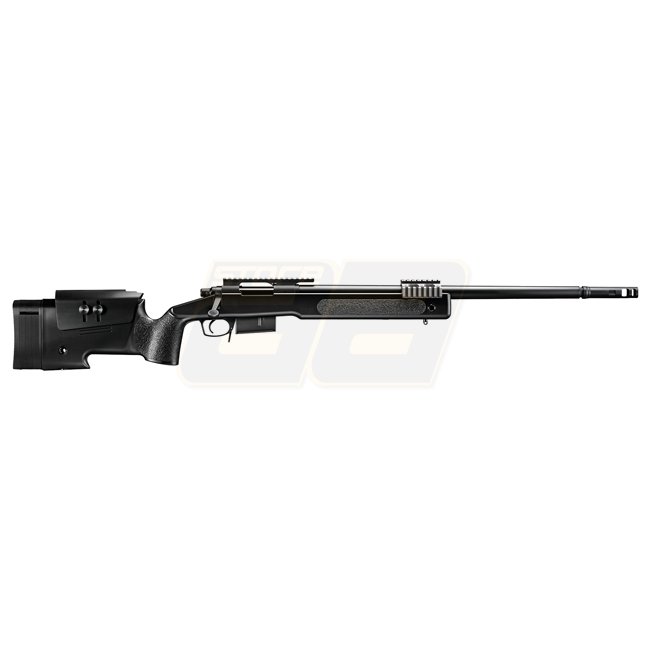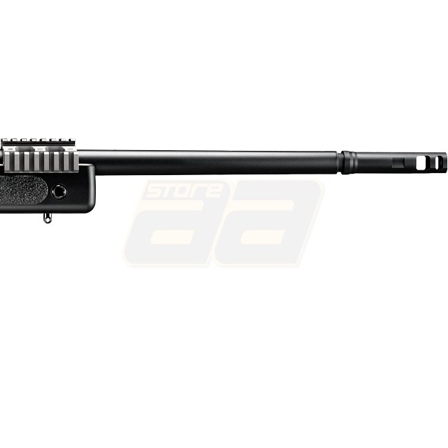 Fusil de précision à ressort Marui M40A5 de haute qualité en couleur noire avec une crosse en métal/polymer durable. Caractéristiques : chargeur de 35 coups, longueur de 1200 mm, poids de 3400 g et canon intérieur de 280 mm. Tire à 280-300 FPS avec 0,73-0