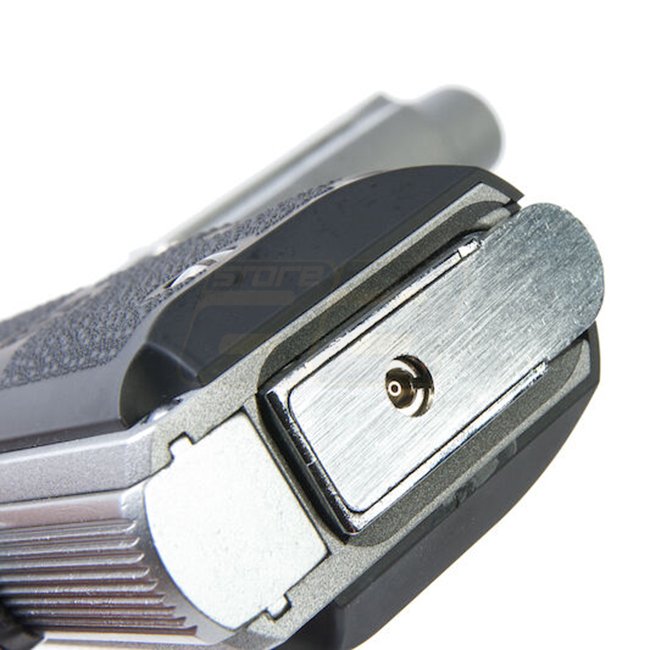 Pistolet à gaz à culasse mobile Marui V10 compact et puissant de couleur argentée élégante. Conçu pour une précision et une performance ultimes, parfait pour les missions tactiques.